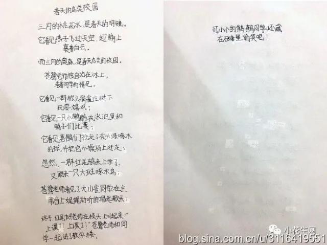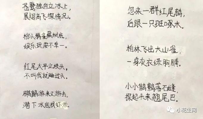 前两句是书上的句子,下面关于奥森的鸟,就是根据他写的打油诗改编的,估计应该符合要求吧!当晚,我为了鼓励他,把他用诗写的观鸟记录,放在了朋友圈,居然得到30多条评论!有说:押韵、有趣、字又好的。有说:好文采的。有说:让孩子看看啥叫中文的。有说:好几个字不认识的。反正都是表扬的。