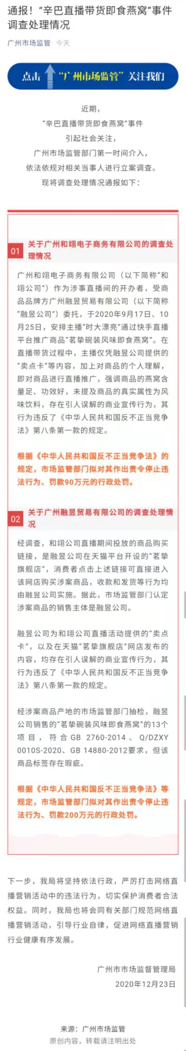 12月23日,微信公号"广州市场监管"发文称,近期,"辛巴直播带货即食燕窝"事件引起社会关注,广州市场监管部门第一时间介入,依法依规对相关当事人进行立案调查。