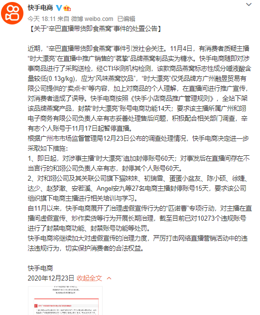 辛巴公司的打击不止于此,在被市场监管部门公布处罚消息后,快手电商官方微博发布关于"辛巴直播带货即食燕窝"事件的处置公告。