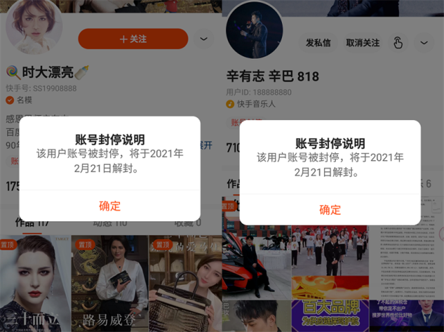 截至发稿,网传图片显示"时大漂亮"、"辛有志 辛巴818"账号处于停封状态,将于2021年2月21日解封。