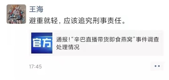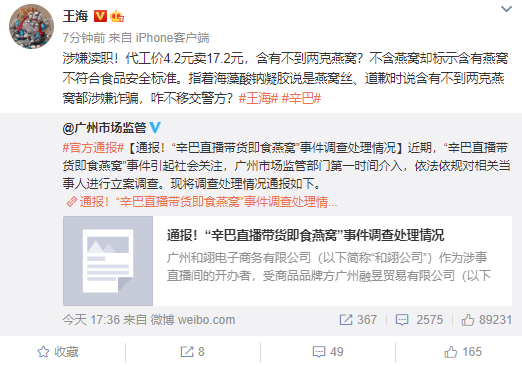 不过官方对辛巴直播间售"假燕窝"事件调查并没有结束。