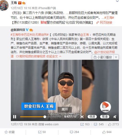 此前,王海在接受媒体采访时曾表示,辛巴不应该只判 15 年,而应该是无期徒刑。在微博上,王海称,《刑法》第二百六十六条 诈骗公私财物,数额特别巨大或者有其他特别严重情节的,处十年以上有期徒刑或者无期徒刑,并处罚金或者没收财产。