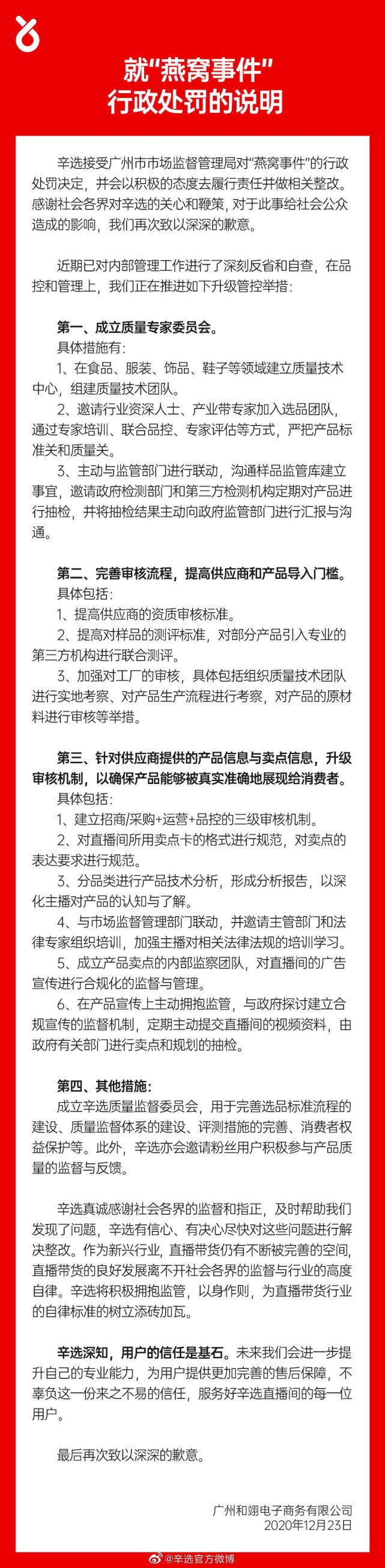 12月23日晚间,辛选官方微博对广州市市场监督管理局"燕窝事件"调查处理情况作出回应。辛选表示,接受行政处罚规定,积极整改,并对此事给社会公众造成的影响致歉。