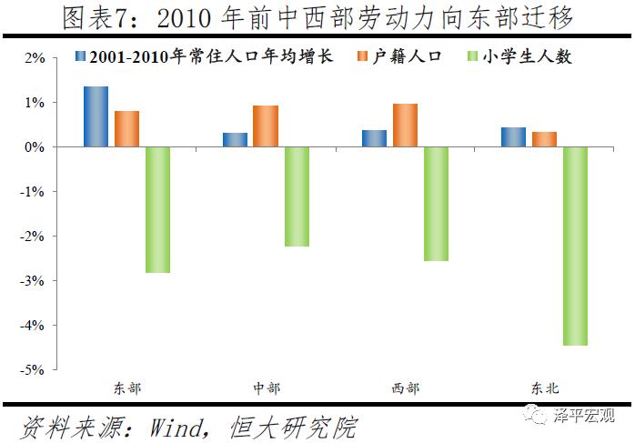 1978-2010年,从中西部迁往东部地区的人口以劳动力为主,并且多数未迁户籍、也未带子女,中西部留守儿童现象非常明显。改革开放后,人口大量向经济率先发展的东部地区集聚,1978-2010年东部、中部、西部、东北地区常住人口分别年均增长1.39%、0.86%、0.85%、0.73%,常住人口占比分别变化4、-1.5、-1.7、-0.8个百分点。但东部地区户籍人口、小学生数并未随常住人口大幅增长,东部、中部、西部、东北地区户籍人口分别年均增长1.06%、1.14%、1.1%、0.69%,户籍人口占比分别变化0.1、0.8、0.5、-1个百分点;东部、中部、西部、东北地区小学生数分别年均增长-1.12%、-1.11%、-1.03%、-2.60%,小学生数占比分别变化0.8、0.8、1.6、-3.2个百分点。