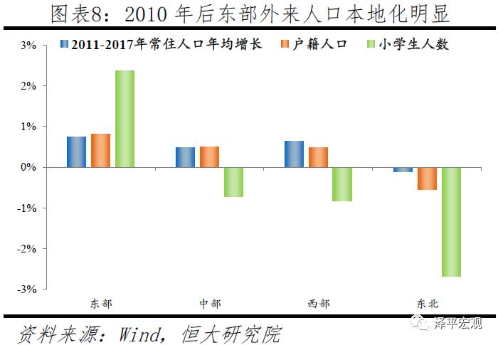 2010年左右以来,部分人口回流中西部,东部地区面对用工压力主动推进大学毕业生、技能人才等外来人口本地化,户籍人口和小学生增速明显加快,东北地区人口加速流出。2009年在长三角和珠三角地区务工的外出农民工占全国外出农民工比例分别比上一年下降2.4%和7.6%,2009年下半年东部沿海地区出现明显的“用工荒”;2013-2017年高校毕业生在东部地区就业规模虽持续增长,但占比从65.7%降至56.7%(参见麦可思研究院《中国大学生就业报告》)。面对用工压力,东部地区主动深化户籍制度改革、吸引外来人口安居乐业。2011年起以鞋服产业闻名全国的晋江在福建率先实行零门槛“居住证”制度,并于2013年率先实行“无房也落户”政策。在2014年国务院要求进一步推进户籍制度改革后,2015年福建宣布全面放开除福州、平潭、厦门外地区的落户限制;广东宣布,除广州深圳外,放开直系亲属投靠,放宽大专以上(含大专)学历毕业生及技能人才、特殊专业人才入户条件等。2011-2017年,东部、中部、西部、东北地区常住人口分别年均增长0.74%、0.48%、0.63%、-0.1%,常住人口占比分别变化0.6、-0.1、0.2、-0.3个百分点。尽管东部地区常住人口增长率明显下降,但其户籍人口和小学生增长率却不降反升。2011-2017年,东部、中部、西部、东北地区户籍人口分别年均增长0.82%、0.5%、0.48%、-0.54%,户籍人口占比分别变化0.7、0、-0.1、-0.6个百分点。东部、中部、西部、东北地区小学生数分别年均增长2.38%、-0.72%、-0.83%、-2.69%,小学生数占比分别变化5.2、-2、-2.2、-1个百分点。其中,2014-2017年东部地区在常住人口年均增速较2011-2013年下降0.02个百分点,但户籍人口年均增速反而上升0.22个百分点。