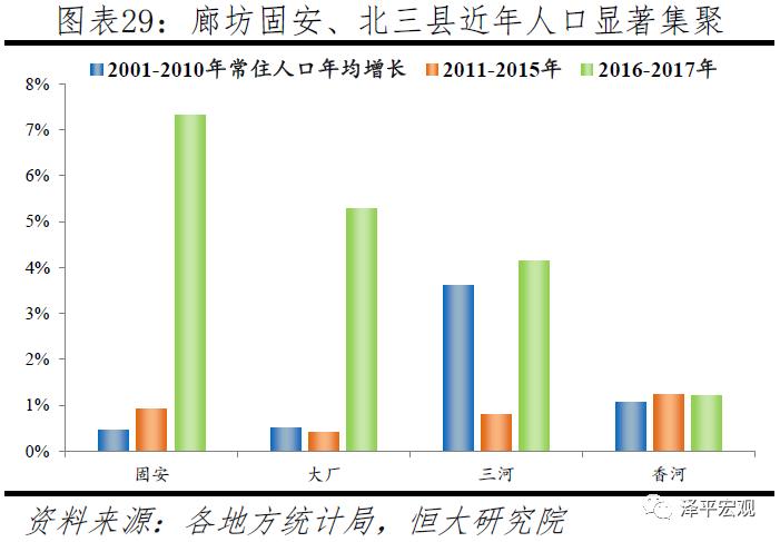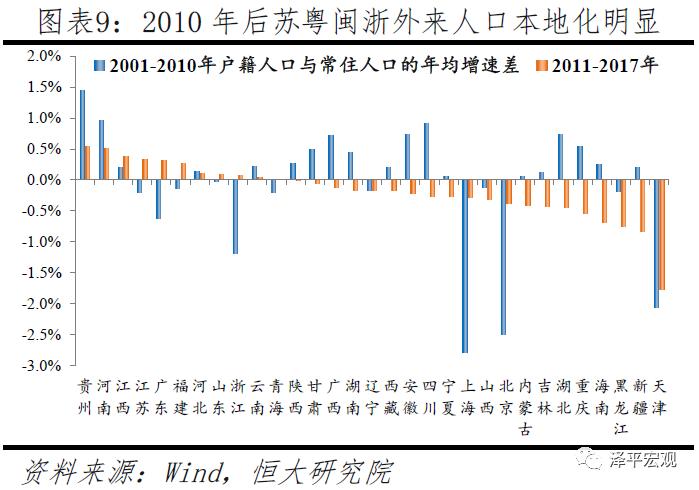 从人口流入地区来看,近年人口流动主要呈现两类特征:一是人口流动更加大城市化和都市圈化,常住人口占比仅32%的千万级大都市圈对全国人口增量的贡献率持续超过50%。2015年后大城市大幅放宽落户,并随后在全国范围内引发激烈的“抢人”大战,人口更加向一二线大城市流入。例如,广东省2016、2017年常住人口增长320万,仅广州、深圳合计增长高达215万,对全省人口增长贡献率为67.1%。广深较宽松的落户政策和超强人口吸引力是广东省近年人口流出地区占比高达八成的重要原因,珠三角地区除广州、深圳、佛山、珠海外的多数地区也处于人口流出状态。除了大城市化外,人口流动的都市圈化特征也越发明显。从人口增量贡献看,2000年后24个1000万人以上大都市圈以当前32%的常住人口占比持续贡献全国50%以上的人口增量,这主要由人口占比仅18%的人口流入地区贡献(剔除数据缺失地区)。从人口流入地区占比看,人口流入地区中位于大都市圈的地区个数占比逐渐上升,扣除数据缺失地区,2001-2010年、2011-2015年、2016-2017年分别为17.7%、18.9%、20.9%。2016-2017年全国大都市圈内有37.2%的地区人口流入,而同期非大都市圈地区仅有27.8%的地区人口流入。长三角地区上海、南京、杭州等都市圈周边县市的人口流入地区最为密集。此外,尽管北京近年控人导致人口减少,但人口外迁导致北京都市圈周边的廊坊固安、北三县等地人口显著集聚,2001-2010年、2011-2015年、2016-2017年四县市合计年均人口增长分别为2.5、1.4、7.3万人。除北京外的其他大都市圈外围县市近年并未出现如此显著的人口增长,多数人口仍流入中心城市市辖区。