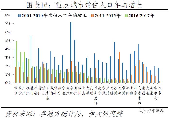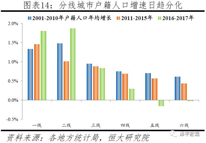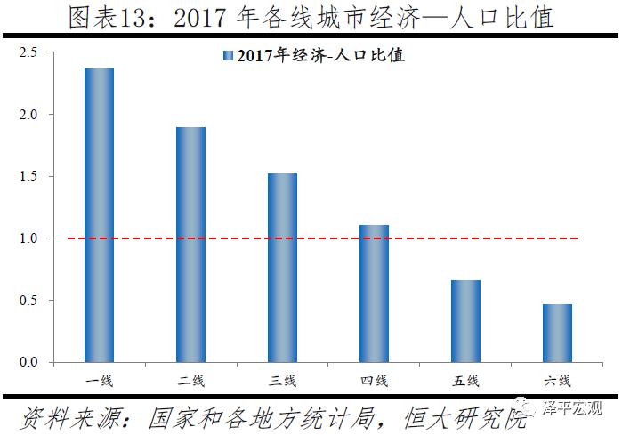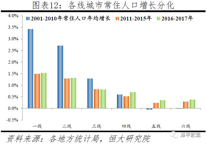 一二线城市常住人口持续大幅流入,三线稍有流入,四线基本平衡,五六线持续净流出。从人口增长看,2001-2010年,一线、二线、三线城市常住人口年均增长率分别为3.4%、2.7%、1.3%,2011-2015年分别放缓至1.5%、1.3%、0.8%,2016-2017年亦保持同样增速,人口持续流入;四线城市在上述三个时期常住人口年均增长率分别为0.6%、0.5%、0.7%,人口流入流出基本平衡;以中西部地区为主体的五六线城市受益劳动力回流,常住人口则由负增长转为正增长、但仍低于自然增长率,人口持续净流出。从人口占比看,2001-2010年一、二、三线城市常住人口占比分别上升1.1、2.3、0.5个百分点,四、五、六线城市则分别下降0.3、2.4、1.8个百分点(因各地区人口数据加总不等于全国,合计的上升与下降占比不完全相等)。2011-2015年,一、二、三线城市常住人口占比继续分别上升0.2、0.5、0.2个百分点,四线占比保持不变,五、六线则分别下降0.4、0.2个百分点。2016-2017年,在剔除全部缺常住人口地区的情况下,一、二线城市常住人口占比分别上升0.1、0.2个百分点,三、四线城市占比保持不变,五、六线城市均下降0.1个百分点,表明人口流动放缓但仍向一二线城市流入。基于人随产业走、人往高处走的人口流动逻辑,2017年一二三四五六线城市的经济—人口比值分别为2.4、1.9、1.5、1.1、0.7、0.5。这表明一二三线城市常住人口未来仍将持续流入,而五六线城市人口将继续大幅流出。