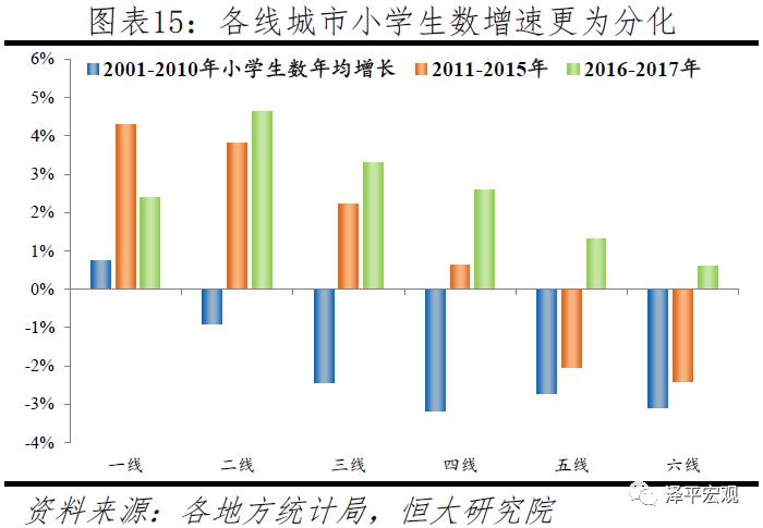 在外来人口向一二三线城市本地化的背景下,小学生增速的城市分化更为明显。2001-2010年,在全国小学生数年均增长-2.7%的背景下,一二三线城市小学生数年均增速分别为0.7%、-0.9%、-2.4%,四五六线城市小学生年均增速分别为-3.2%、-2.7%、-3.1%,分线城市最大值和最小值的差为3.9个百分点。而到2011-2015年,在全国小学生数年均增长为-0.5%的背景下,一二三线城市小学生数年均增速分别为4.3%、3.8%、2.2%,而四五六线城市小学生年均增速分别为0.6%、-2%、-2.4%,分线城市增速最大值和最小值的差扩大到6.7个百分点。2016-2017年,在全国小学生数年均增长为2.1%的背景下,一二三线城市小学生数年均增速分别为2.4%、4.6%、3.3%,一线城市因房价高企、学位供需紧张等因素而增速低于二三线城市,四五六线城市小学生年均增速分别为2.6%、1.3%、0.6%。
