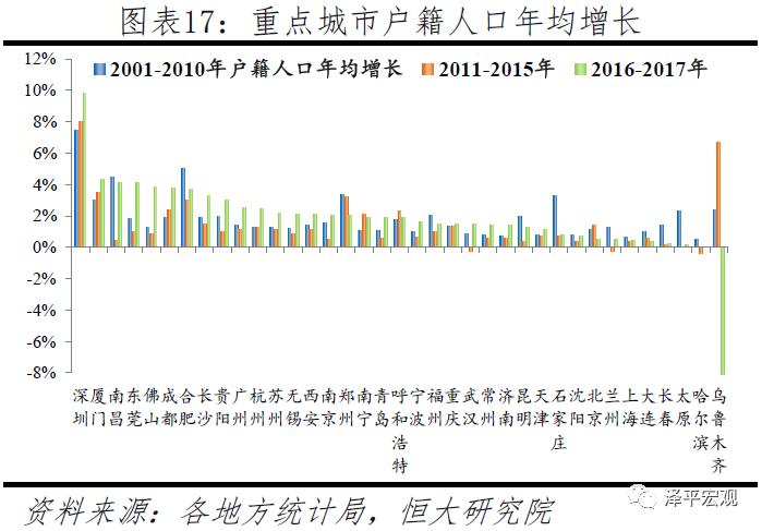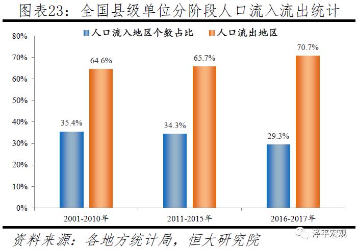哪些地区人口在流入,哪些在流出?1)中国人口流动已从四六分化走到三七分化,表明人口流动越来越集聚化。扣除数据缺失导致难以识别的68个地区,人口流出地区个数持续上升,2001-2010年、2011-2015年、2016-2017年分别为1362、1385、1491个,占比从64.6%先增至65.7%,又继续增至70.7%;人口流入地区个数持续下降,上述三个时间段分别为747、724、618个,占比从35.4%先降至34.3%,又继续降至29.3%。人口流出地区方面,分地区看,东北地区人口流出地区个数占比从68.4%激增至97.7%,东部地区从57.8%增至68.5%,西部地区从65.9%增至69.4%,只有中部地区从67.4%微降至66.4%;从行政建制看,地级及以上城市人口流出地区个数占比从20.4%增至47.4%,县级市从62.8%增至76.3%,建制县从73.6%微增至73.9%;分线看,一线城市中京沪由于控人近年人口流出,二线城市人口流出地区个数占比从0增至17.2%,三线城市从18.3%增至52.1%,四线城市从45.5%增至57.3%,五线城市从70.6%增至71.6%,六线城市从70.4%增至75.7%。人口流入地区方面,主要分为两类:一是人口流动更加大城市化和都市圈化,常住人口占比仅32%的千万级大都市圈对全国人口增量的贡献率持续高于50%。二是在农民工老化和产业转移的背景下,皖川鄂宁湘等部分中西部省份人口流入地区明显增多。2)中国人口流动展望及启示:人随产业走、人往高处走,人口未来将持续向一二线大城市大都市圈及部分区域中心城市集聚。对房地产市场,把人口流入与置业需求上升直接关联的传统判断需进一步深化,人口结构年轻且常住人口、户籍人口、小学生三个数据均明显大幅增长的地区更优。深化推进户籍制度、土地制度等改革,进一步消除人口自由迁徙的枷锁。区域及城市发展规划安排、产业布局、土地供应等因应顺应人口流动趋势,房地产长效机制最根本的是人地挂钩和金融稳定,实现供求平衡和需求平稳释放。