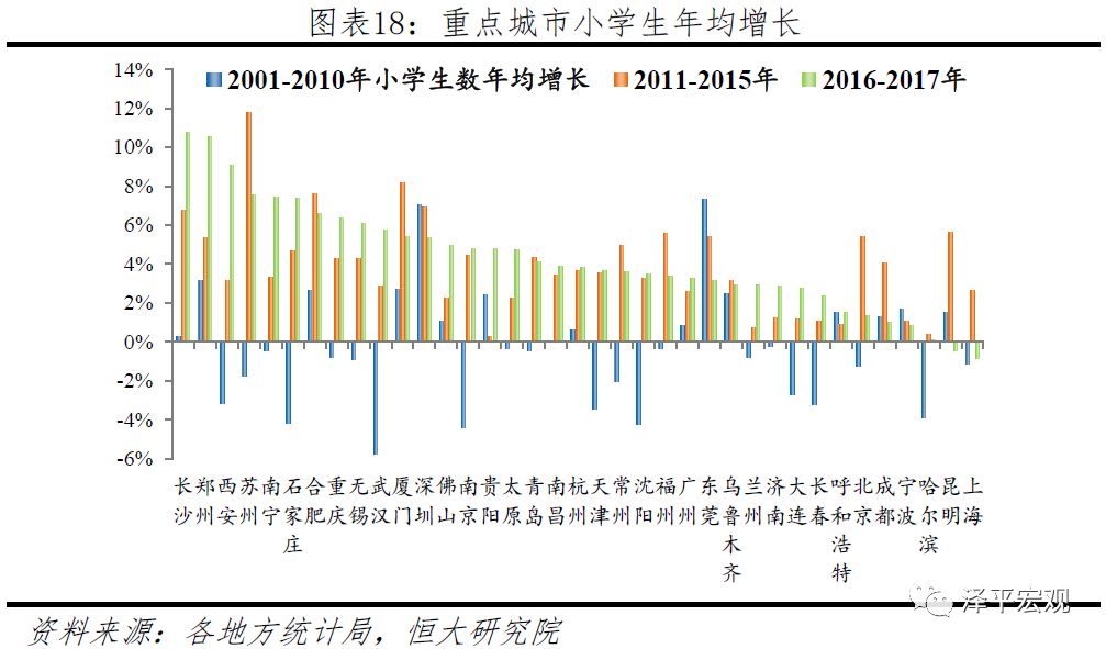 2016年起部分重点城市因“抢人”大战常住人口增长加速,一些中西部核心城市小学生增速显著跃升。2016-2017年,深圳、广州、杭州、长沙、西安等市辖区常住人口年均增速较2011-2015年分别上升3、2.4、2.1、1.7、1.4个百分点;此外,佛山、宁波、东莞、成都、南宁、贵阳等市辖区常住人口增速也有明显上升,“抢人”效果较显著。一度人口增长低迷的南京、苏州、无锡等市辖区2016-2017年户籍人口年均增速均显著提升到2%以上,但常住人口年均增速改善不明显,表明这几座城市在“抢人”大战中放松户籍限制对新增外来人口影响有限。从小学生增速看,2016-2017年西安、郑州、贵阳、南宁、长沙等中西部核心城市市辖区小学生年均增速分别较2011-2015年跃升5.9、5.2、4.5、4.1、4个百分点。东部重点城市2016-2017年小学生年均增速普遍并未明显跃升,很多还出现下降,小学生增速的优势已被中西部核心城市赶超。2016-2017年小学生年均增速排名前十的重点城市除苏州、石家庄、无锡外均位于中西部。