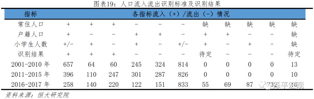 综合常住人口、户籍人口、小学生三个指标,人口流入流出的具体识别标准如下:1)若常住人口数据可得,则以常住人口为标准识别人口流入流出。2)若常住人口缺失、且户籍人口和小学生均流出,则识别为流出。从有完整数据的地区看,2001-2010年这种情况流出概率超过90%,在2011-2015年流出概率接近70%。3)若常住人口缺失、户籍人口和小学生只有一个流出,也识别为人口流出。从2001-2010年、2011-2015年有完整数据的地区看,该种类型流出概率均接近七成。4)若常住人口缺失、且户籍人口和小学生均流入,从历史经验看难以判断其常住人口是否流入,2011-2015年流入概率仅为46.5%,因此将这种类型地区列为待定。比如,当前东部部分地区同时存在外来人口回流和本地化两种现象,即常住人口流出、户籍人口和小学生流入;相反,一些传统劳务输出地区,部分劳动力回流,但同时也有部分外出劳动力迁出户籍到就业地安家,即常住人口流入、户籍人口和小学生流出。