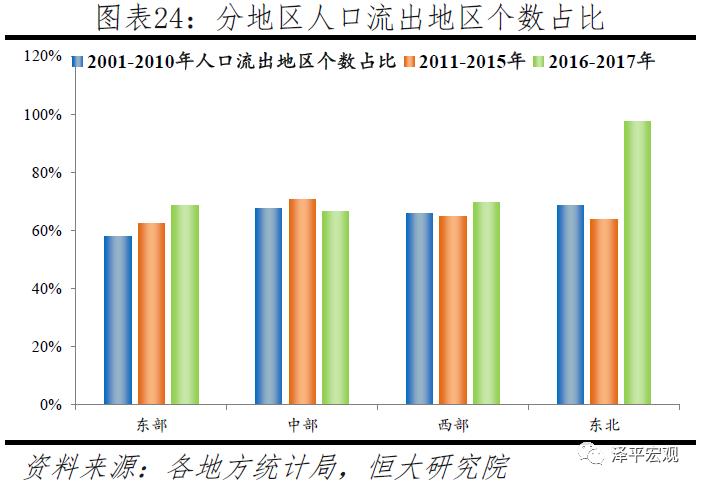分地区看,东北地区人口流出地区个数占比从68.4%激增至97.7%,东部地区从57.8%增至68.5%,西部地区从65.9%增至69.4%,只有中部地区从67.4%微降至66.4%。东部地区人口流出地区个数逐步上升,2001-2010年、2011-2015年、2016-2017年分别为290、313、344个,占比从57.8%增至68.5%;中部地区人口流出地区个数先升后降,三个时间段分别为377、395、371个,占比从67.4%微降至66.4%;西部地区人口流出地区个数三个时间段分别为578、568、609个,占比从65.9%增至69.4%;东北地区人口流出地区个数近年急剧上升,三个时间段分别为117、109、167个,占比从68.4%增至97.7%,几乎全域人口流出。由于东北地区缺失常住人口地区最多,我们的判断标准可能存在少许高估,但黑龙江、辽宁、吉林人口先后从2014、2015、2016年开始人口陷入负增长,核心城市人口也负增长或基本持平,高估的空间不大。分省看,扣除京津沪和缺失数据较多的新疆、西藏、青海(东北三省、江西、山东也有少量地区剔除),吉林、黑龙江几乎全境人口流出,然后依次为江西95.1%、辽宁92.5%、海南88.9%、山东85.6%、贵州82.1%、广东80.8%。广东作为我国第一经济强省,其人口流出地区占比高主要是因为内部发展差距巨大,珠三角发达地区对粤西、粤东、粤北人口有强大吸引力。