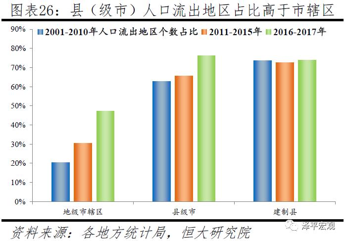 从行政建制看,地级及以上城市人口流出地区个数占比从20.4%增至47.4%,县级市从62.8%增至76.3%,建制县从73.6%微增至73.9%。地级及以上城市人口流出地区个数明显逐渐增多,2001-2010年、2011-2015年、2016-2017年分别为58、87、135个,占比从20.4%增至47.4%;县级市人口流出地区个数同样逐渐增多,三个时间段分别为225、235、273个,占比从62.8%增至76.3%;建制县人口流出地区个数三个时间段分别为1079、1063、1083个,占比从73.6%微增至73.9%。地级及以上城市市辖区和县级市人口流出地区占比均在近年显著上升。