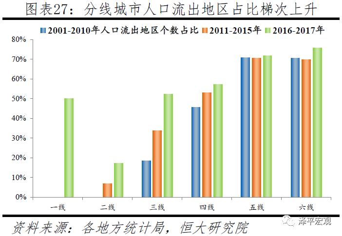 分线看,一线城市中京沪由于控人近年人口流出,二线城市人口流出地区个数占比从0增至17.2%,三线城市从18.3%增至52.1%,四线城市从45.5%增至57.3%,五线城市从70.6%增至71.6%,六线城市从70.4%增至75.7%。一线城市前些年一直保持强劲的人口流入态势,但北京、上海因严控人口近年常住人口已开始流出。二三四线城市2001-2010年、2011-2015年、2016-2017年人口流出地区占比均逐渐上升,二线城市三个时间段人口流出地区个数分别为0、2、5个(剔除城市也可能人口流出,低估),占全部二线城市个数的比例从0增至17.2%;三线城市三个时间段人口流出地区个数分别为13、24、37个,占比从18.3%上升到52.1%;四线城市三个时间段人口流出地区个数分别为116、135、146个,占比从45.5%增至57.3%。五六线城市人口流出地区个数占比总体上也有微增趋势,其中五线城市从70.6%增至71.6%,六线城市从70.4%增至75.7%。可以看出,三线城市人口流出地区个数占比增幅最为显著,达33.8个百分点,远高于二线的17.2、四线的11.8、五线的1.0、六线的5.4个百分点。