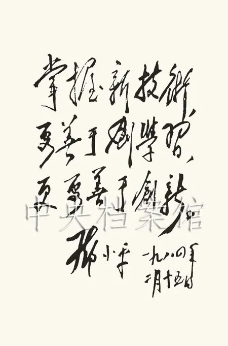 △邓小平为宝钢题词:“掌握新技术,要善于学习,更要善于创新。”一个月后,邓小平在与上海市新的领导班子见面时,也表达了同样的态度:“宝钢,你们市委还是要管起来。第一要干,第二要保证干好。国内对宝钢议论多,我们不后悔,问题是要搞好。”