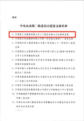日前,中核集团三门核电仪控党支部被国务院国资委党委命名为“中央企业基层示范党支部”称号。据悉,国务院国资委党委这次命名的中央企业第二批基层示范党支部共100个,在推进党支部建设标准化,以高质量党建引领世界一流企业建设中发挥了重要作用,具有先进性、示范性、引领性。