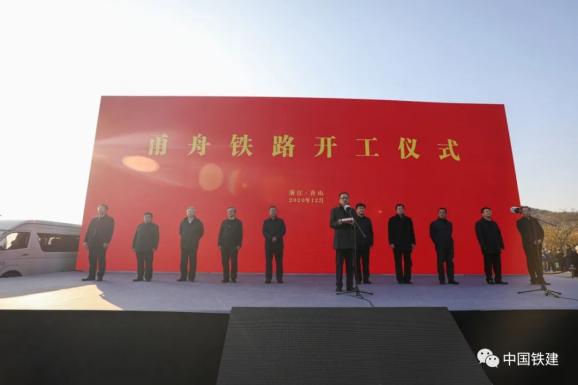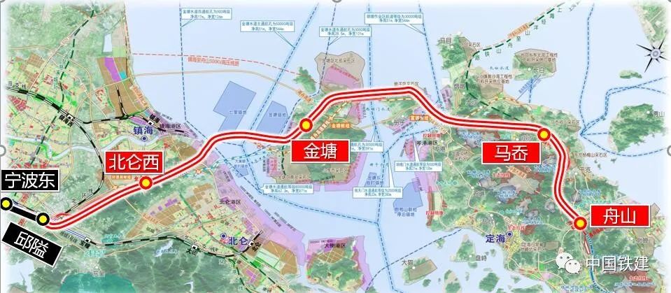 开工仪式现场甬舟铁路西起宁波东站,经宁波市鄞州区、北仑区,舟山市金塘岛、册子岛、富翅岛至舟山本岛,设计时速250公里,全线共设7个站,其中新建北仑西、金塘、马岙、舟山4座车站,改造宁波东、云龙、邱隘3座既有站。全长76.4公里,其中新建线路长70.1公里。该线路在宁波枢纽向南与甬台温铁路相连,向西南与甬金铁路相连,向西、西北与杭甬客专相连,并通过杭州枢纽连通杭长、宁杭、沪杭、商合杭等线路。