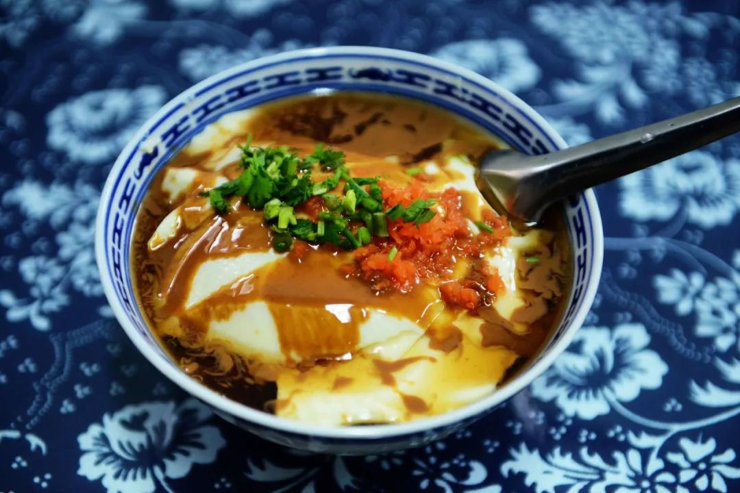 ▲ 上图:泉水制作的豆腐脑,图/图虫·创意;下图:卤汁豆腐脑+香甜酥脆糖油饼, 图/王小懒豆腐脑无论是甜是咸,基本都当做一种流食来吃。喜欢吃甜口的,一般在里边加上蜂蜜、白糖或者红糖,冬季可以吃热的暖身子,夏季可以吃冰的解解暑;喜欢吃咸口的,有西南地区那种加上酱油、辣椒、油盐醋来调味的,还有京津地区这种加卤汁的。