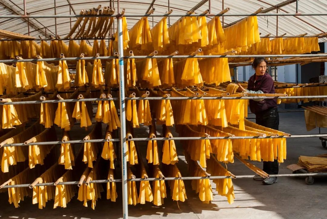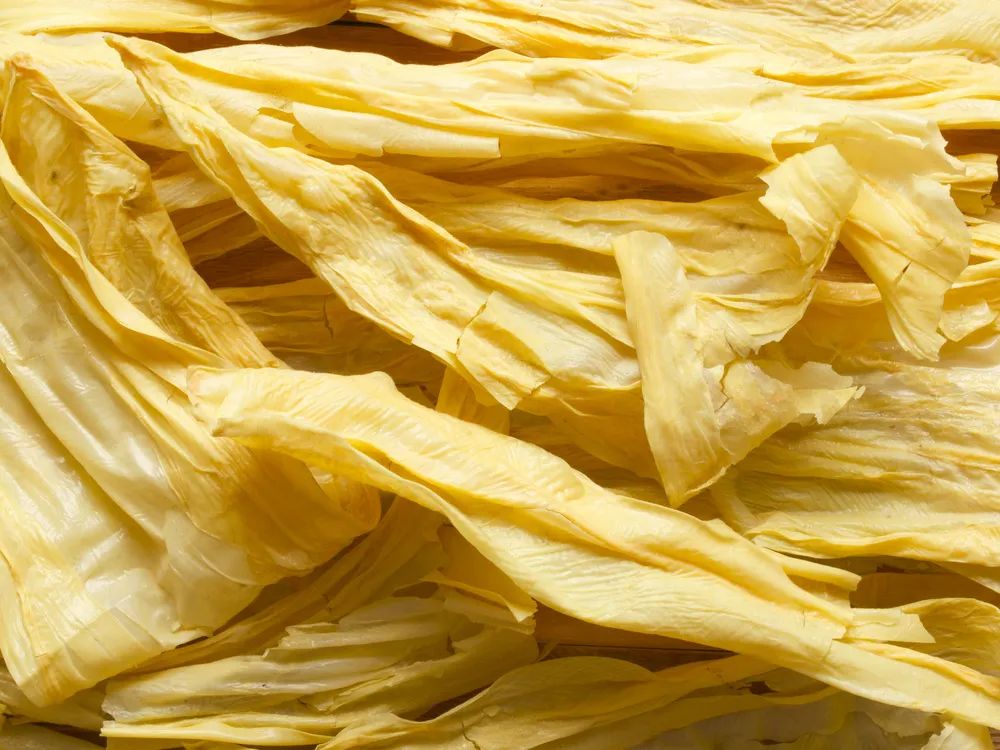▲ 上图:手艺人在晾晒油豆皮,图/阮卫明;下图:豆皮细节,摄影/fkruger,图/图虫·创意腐竹本质上和油豆皮是一种东西,只是形状不同。把油豆皮从豆浆表面挑起后搓在一起,干燥后形似竹枝,这就是腐竹。油炸腐竹是螺蛳粉的灵魂配料,吸满汤汁的腐竹咬上去又弹又脆,汤汁稀释了腐竹的油腻,腐竹增添了螺蛳粉口感上的层次。无论是油炸还是水泡的腐竹,它们都是火锅局里的明星单品。