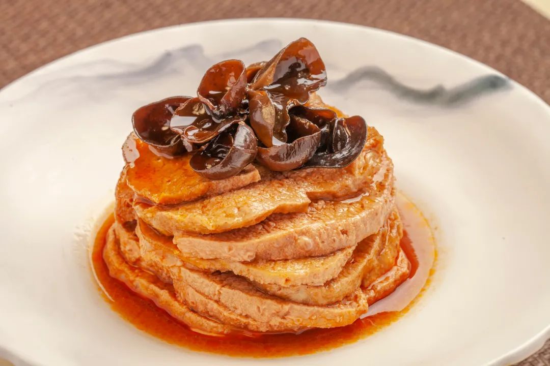 ▲ 上图:成卷的豆腐皮。摄影/风之谷,图/图虫·创意;下图:上海红烧素鸡。摄影/杨百年,图/图虫·创意在扬州,百叶会被切成丝,和高汤一起煮成了大煮干丝;在上海,百叶被切成条再打成了中国结,和五花肉一起炖成了百叶结烧肉。卷成圆棍形的百叶,捆紧煮熟,切片过油后就成了素鸡,这是一碗苏面的灵魂伴侣。