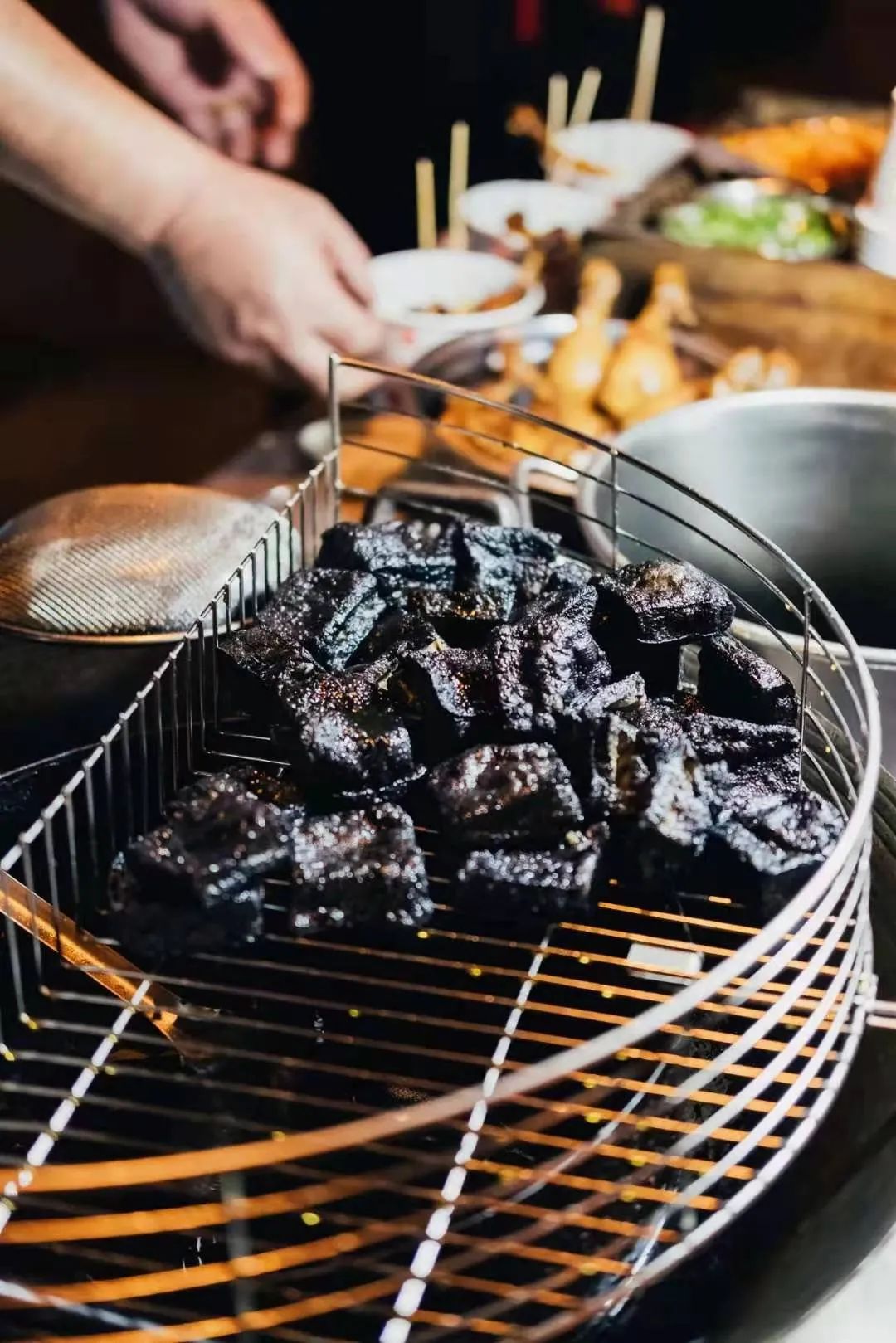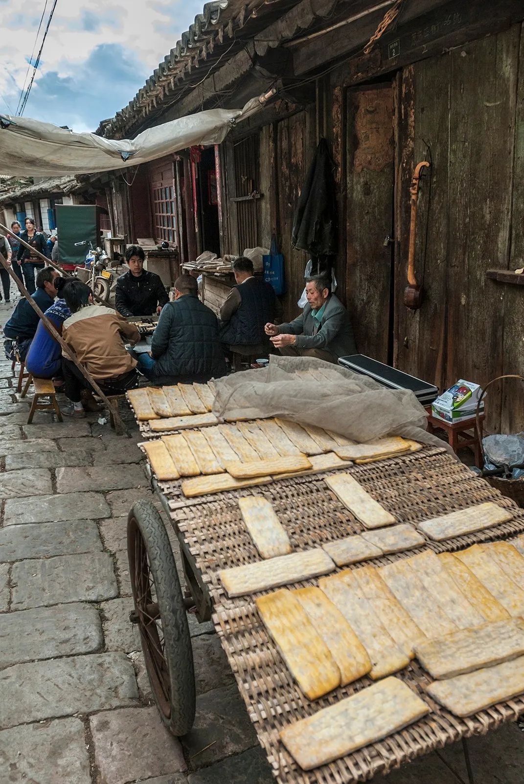 几个人围坐在豆腐摊前,一人一个蘸料碟,老板娴熟的在食客面前拨弄着豆腐,瞅着眼前的美味膨胀变大,热的弹跳起来。有经验的老板按需分配刚从火堆里出来的豆腐,用玉米粒计数。豆腐摊从早开到晚,食客一茬茬的换着,享受烤豆腐美味的同时,小小的一方豆腐摊也成了邻里的社交场所。