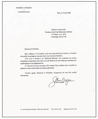 法兰西公学院院长Gilbert Dagron教授相信 “千禧年大奖难题”将会是科学史上的一项重大事件,他为我们提供了不可或缺的支持(见图d中信件)。更为重要的是,我们被允许借用他杰出的助手Véronique Lemaître 女士。这位令人惊喜的女士与巴黎地区的科学记者们保持着密切而友好的关系,她为我们安排了各类采访。孔涅教授在大会前一周接受了《世界报》(Le Monde)的采访,而我也提前三天接受了美联社的访谈。在难题发布的当天早晨,Lemaître女士还召集了媒体发布会,吸引了三十多位科学记者参加。自然而然地,所有的消息都被设置了“禁令”,以防在官方发布之前就遭到曝光。