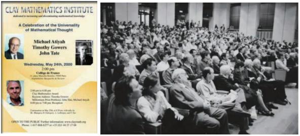 在甄选难题和设置奖金的同时,另一项艰巨的任务是筹备将在巴黎召开的千禧年大会。孔涅教授作为法国方面的联络人,联系了法兰西公学院作为大会的东道主。大会被定于2000年5月24日至25日召开,大奖难题的发布安排在24日下午,而25日则是学术报告会,报告人均为与克雷数学研究所相关的青年学者,包括陶哲轩、Manjul Bhargava, Dennis Gaitsgory等,那时的他们皆未及而立之年。另外,出于保密和出其不意的目的,我们给大会起了一个波澜不惊的名字——克雷数学研究所第二次年度会议。一般而言,举办一个大型国际会议需要提前相当多的时间,以便参与者们提前做好行程规划。由于筹备开始的时间太晚,我们无可避免地陷入了一些困境:在2000年春夏之间,无论时间怎么调整,都会与一些其他的数学会议相冲突。比如,二月份时我们曾希望邀请Raoul Bott和Jean-Pierre Serre两位教授来报告这七个大奖难题,而他们被授予了沃尔夫数学奖,颁奖典礼与千禧年大会的时间是重叠的。另外,由于无法预估参会人员的规模,在大会召开前几天,孔涅教授决定为每位注册参会者签发门票,每张门票上都印有专门的座位号。对于届时未能进场的观众,我们安排了分会场收看直播。孔涅教授以及大洋两岸诸多赋有奉献精神的支持者们,投入了极大的工作热情,最终我们克服了所有困难, 保障了“千禧年大奖”项目的成功实施。