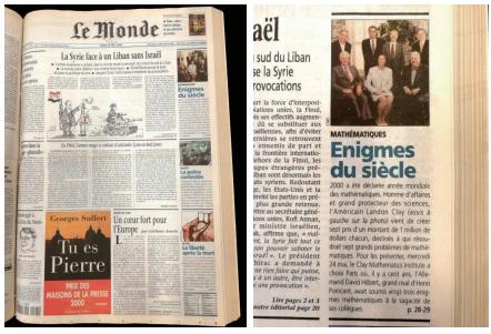 “千禧年大奖难题”公布后的即时反应异常热烈。招待会结束后,我们乘坐大巴车前往晚宴,在车上,Véronique Lemaître女士给我们分发了《世界报》刚刚发行的报纸。该报社每天傍晚刊发次日的报纸,因此日期显示为5月25日。在这份报纸中,科学记者Jean-François Augereau写下了四篇关于“千禧年大奖难题”的不同文章。其中,首页右上方(见图j)刊登了一张包含克雷数学研究所董事会和科学顾问委员会的照片(见图k),这是报社自己在网上找到的, 摄于CMI落成典礼的当天。由美联社的科学记者 Jocelyn Gecker 撰写的长文则刊发在25日世界各地的多家报纸上。这些报道引申出后续成百上千的故事,许多电视网络媒体都争相跟进。