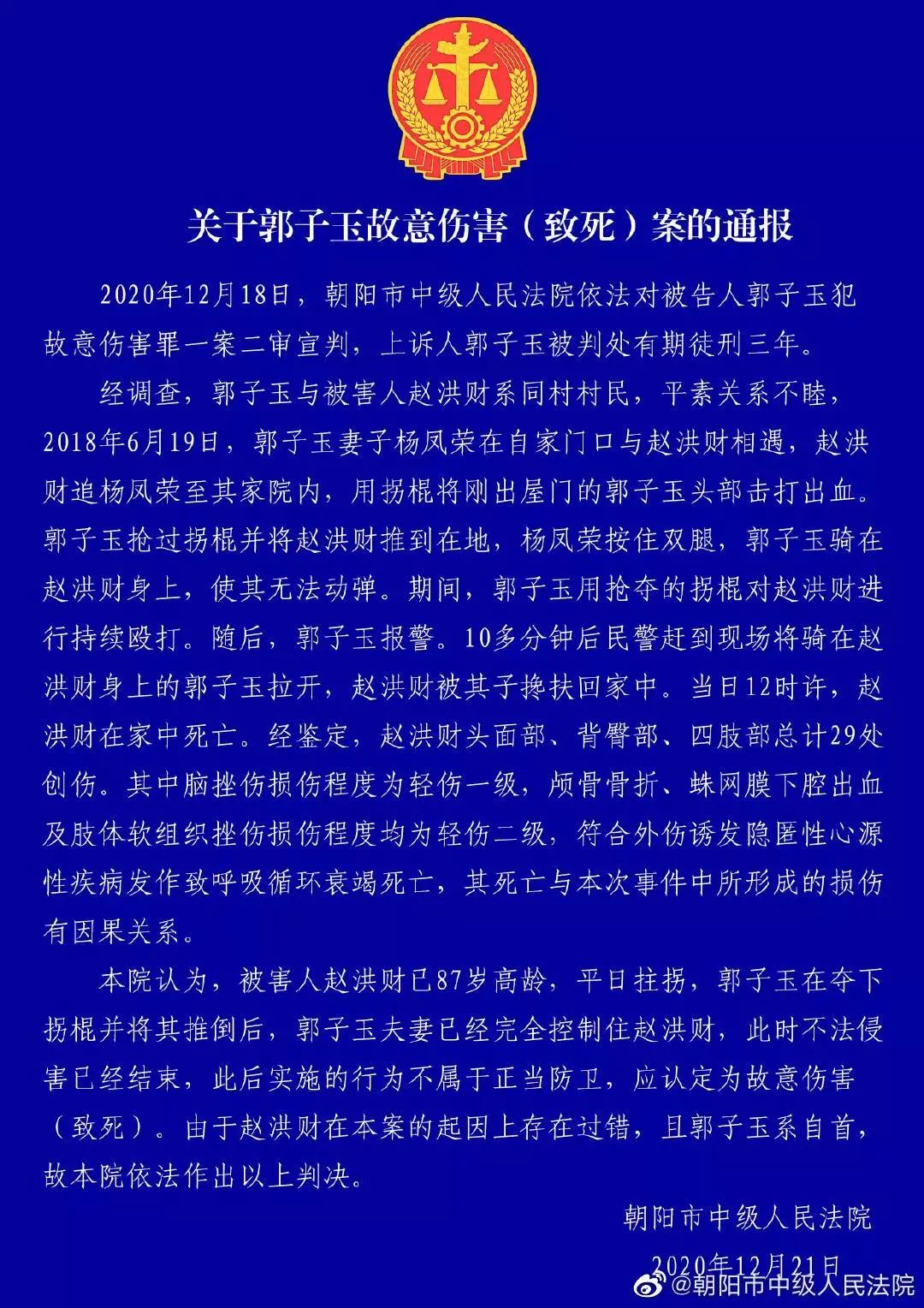 【68岁男子反制87岁持棍上门打人者致死,是正当防卫吗?二审宣判!】近日,朝阳中院依法对被告人郭子玉犯故意伤害罪一案二审宣判,上诉人郭子玉被判处有期徒刑三年。