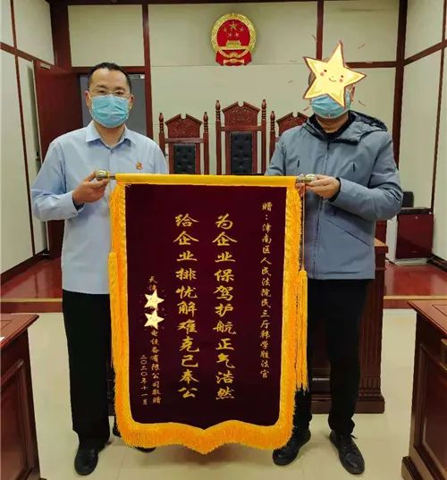 津南区法院民三庭法官收到一原告企业送来写有“为企业保驾护航正气浩然,给企业排忧解难克己奉公”锦旗。
