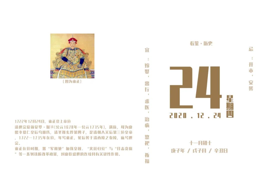 1.1722年12月24日,清朝雍正帝胤禛登上帝位2.1865年12月24日,美国三K党成立