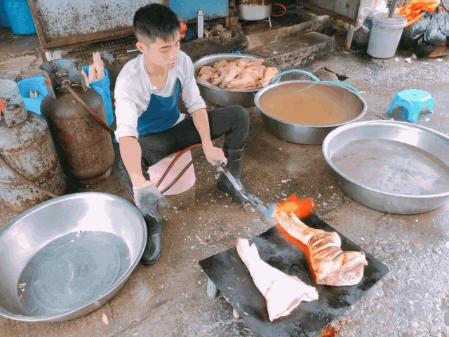 清晨,老板从市场里带回今日所需的十几条猪腿。趁着天色微微亮,开始坐在路边烧猪毛。火枪将猪脚上的粗毛细毛全部烧光,再从头到尾砍成四块:头圈、断轮、四点、蹄尾。