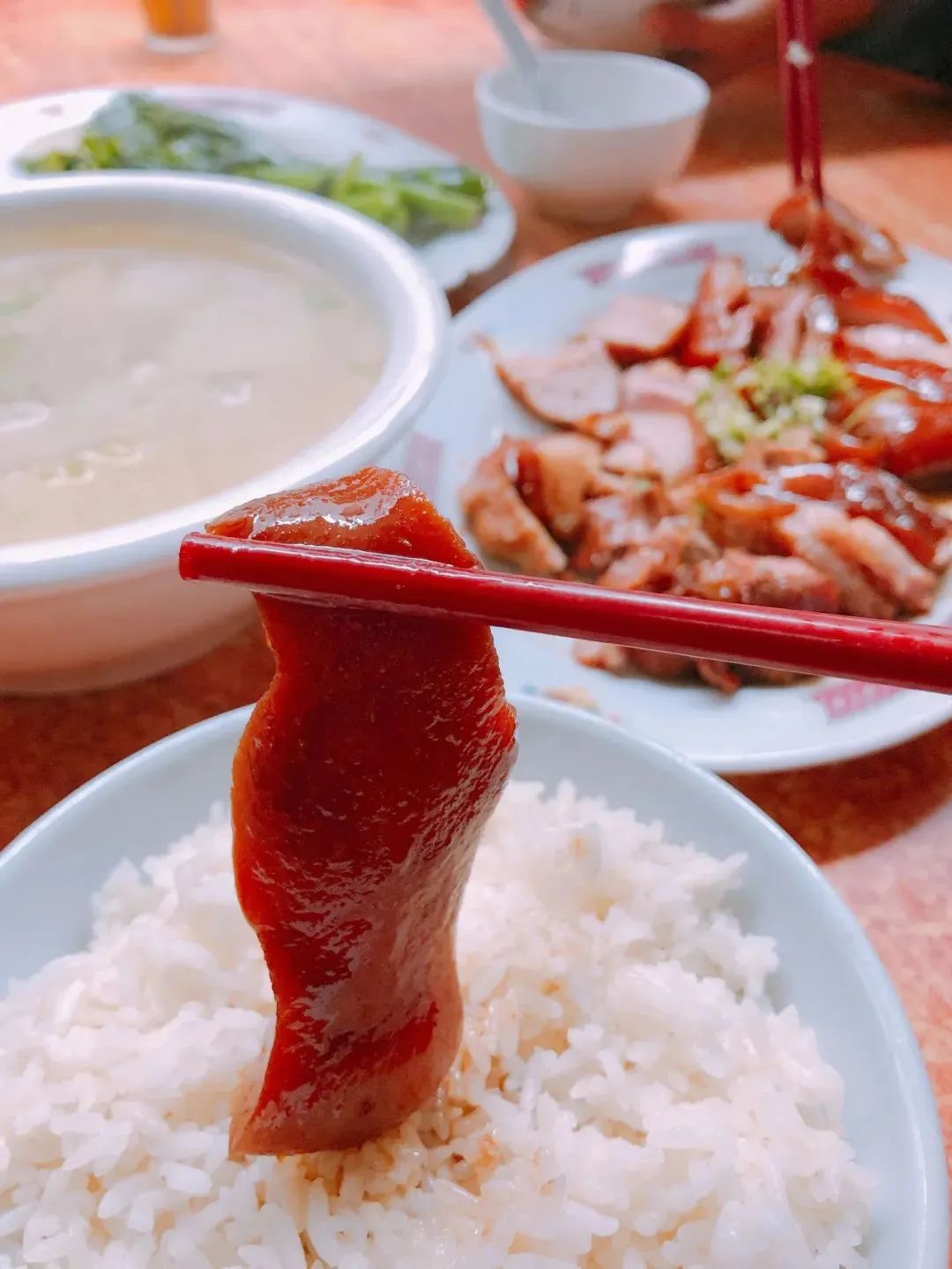 DuangDuang几刀,软糯又不失弹性,肥肉还带着晶莹汁水的就这么被迅速切开分解。在店里吃的话,肉会单独用一个盘子装上,临上桌前浇上一勺“集百条猪腿之精华”的老卤,再分别给你装一些已经弄好的炒菜和酸菜。