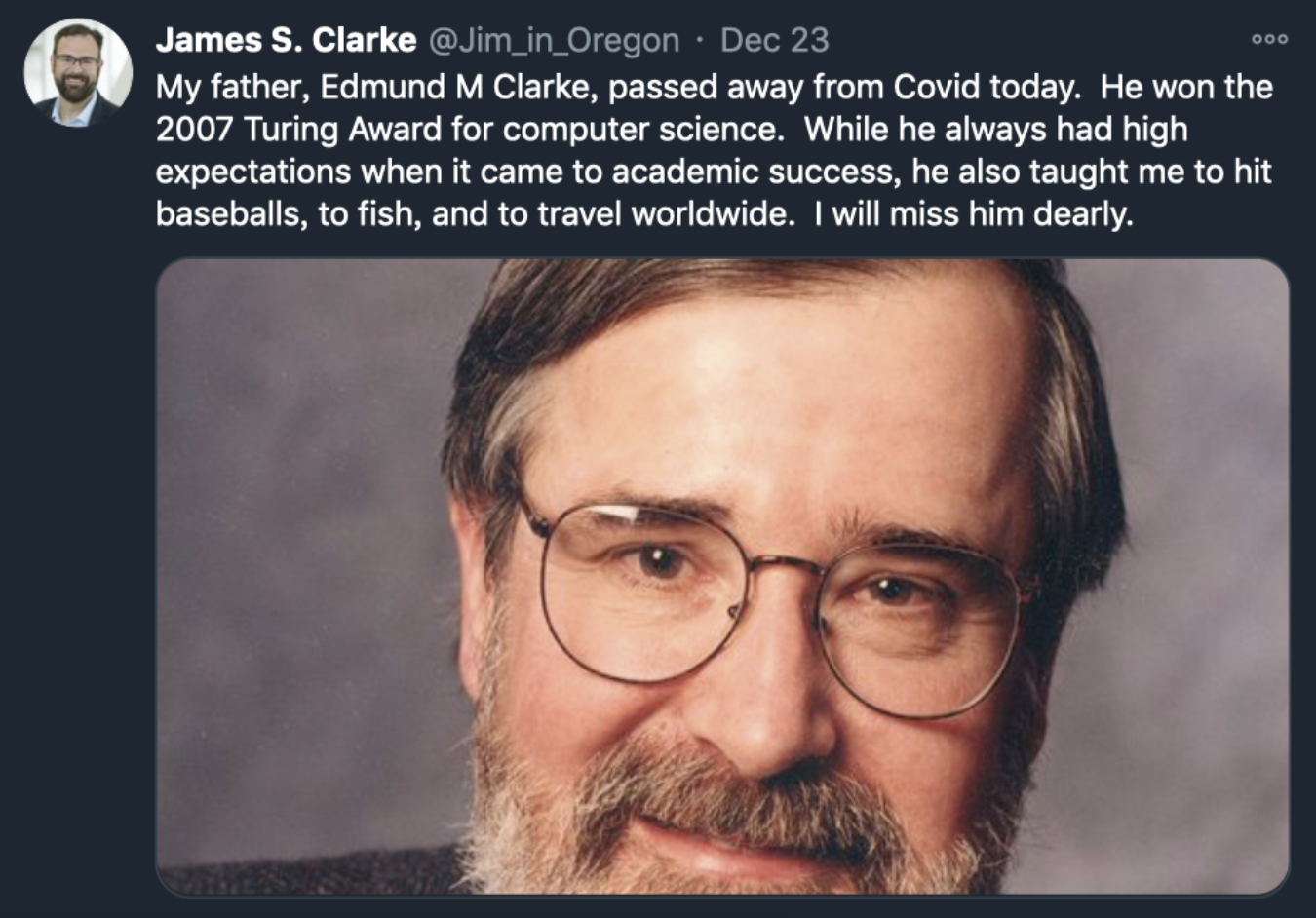当地时间12月23日,英特尔实验室量子硬件研究组总监James S. Clarke在社交媒体发文表示,他的父亲、2007年图灵奖得主爱德蒙·克拉克(Edmund M. Clarke)因感染新冠肺炎不幸去世。