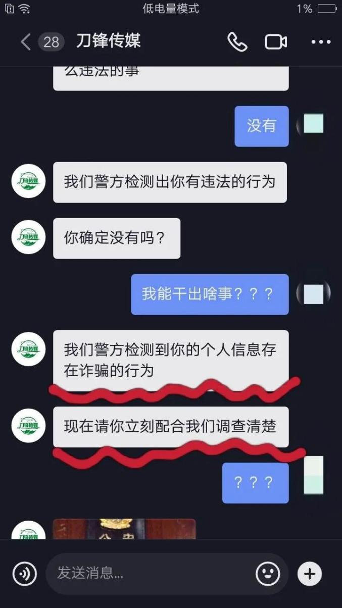 12月中旬的一天,小D在刷小视频的时候看到了有个叫“刀锋传媒”(该账号主人并非骗子,账号被盗目前已拿回)的人加了关注并发来一张人民警察证照片,证件上有清晰的警察照、属地单位和警号等。