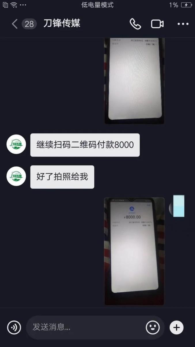 在对方的指挥下,小D拿着爷爷的手机打开了支付宝,通过扫描“检测群”中的收款二维码,支付了5笔——1000、2000、3000、5000、8000。