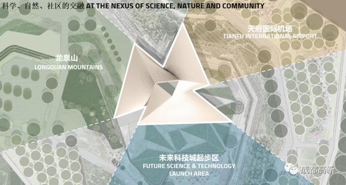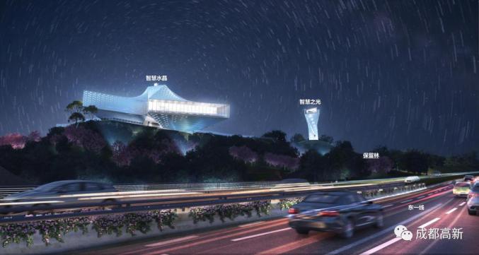 在结构上,智慧水晶建筑主体分为三个立面,分别面向天府国际机场、龙泉山、未来科技城起步区,代表科学、自然与社区,三个立面相互融合,体现未来科技城“人城产”的未来城市发展理念。