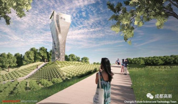 智慧之光是外观形状为火炬形的观景塔,位于未来科技城展示馆外部,高29.5米。通过智慧之光远眺天府国际机场、绛溪河生态公园、未来科技城起步区三大景观,让市民能在此深刻感受到成都“公园城市”和“科技引导”的城市发展思路。
