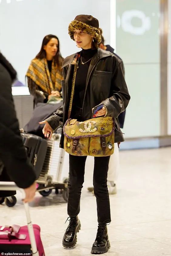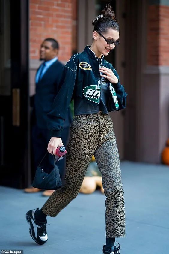超模Bella会选择豹纹的休闲裤或者毛绒渔夫帽用豹纹单品点缀整个look