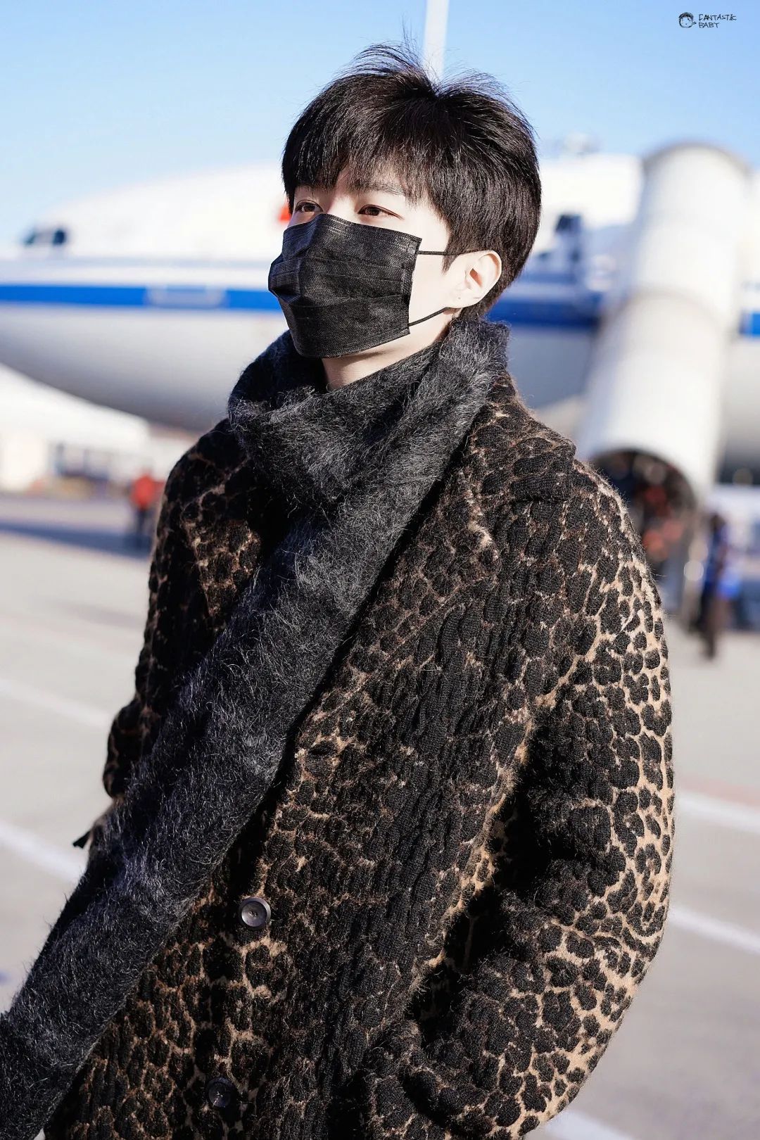 范丞丞选择比较厚重温暖的暗色豹纹大衣搭配同样低调的厚围巾