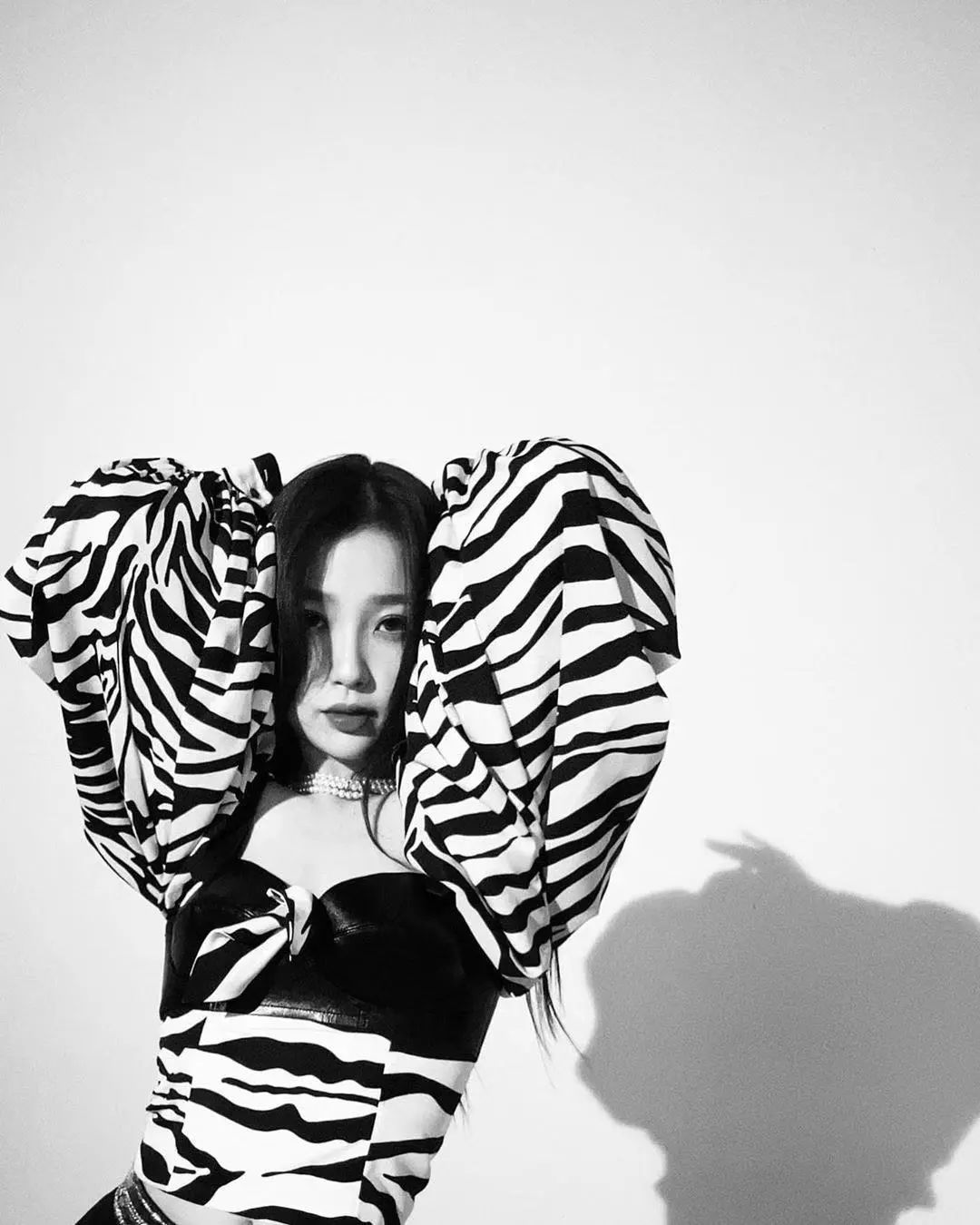 连可爱的欣欣子穿上夸张袖口设计的斑马纹上衣黑色皮质bra外穿