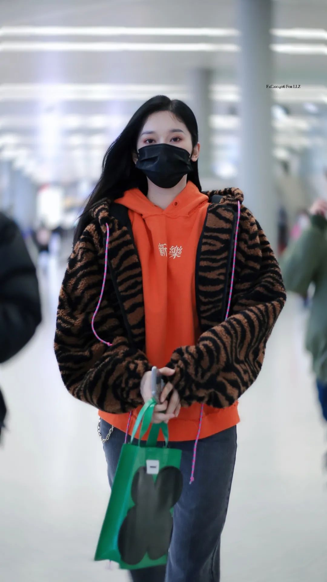 外出坐飞机当然要以舒服为主刘令姿毛茸茸的斑马纹外套搭配hoodie和休闲裤