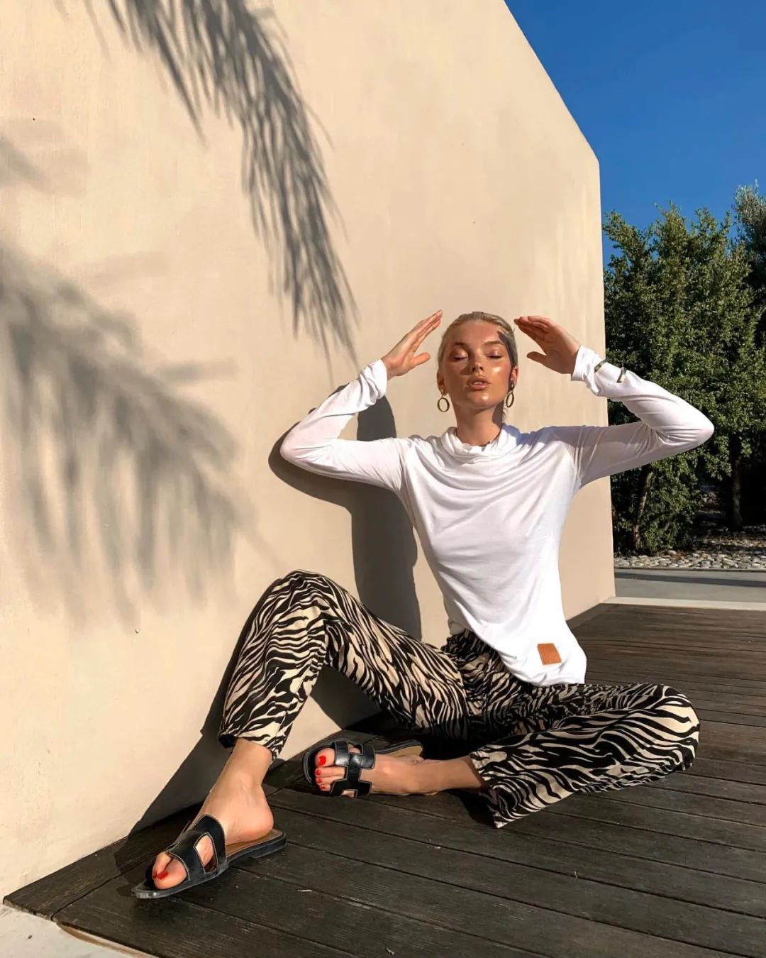 超模也会在度假时选择斑马纹长裤简单的搭配白色休闲上衣和鞋拖