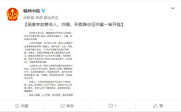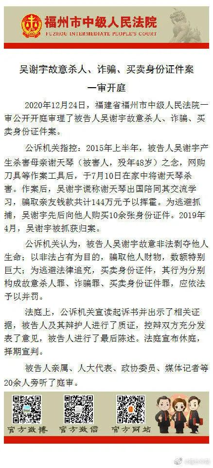 2020年12月21日,福州市中级法院公告显示,将于12月24日上午九点在福州中院第二法庭公开审理被告人吴谢宇故意杀人罪一案。