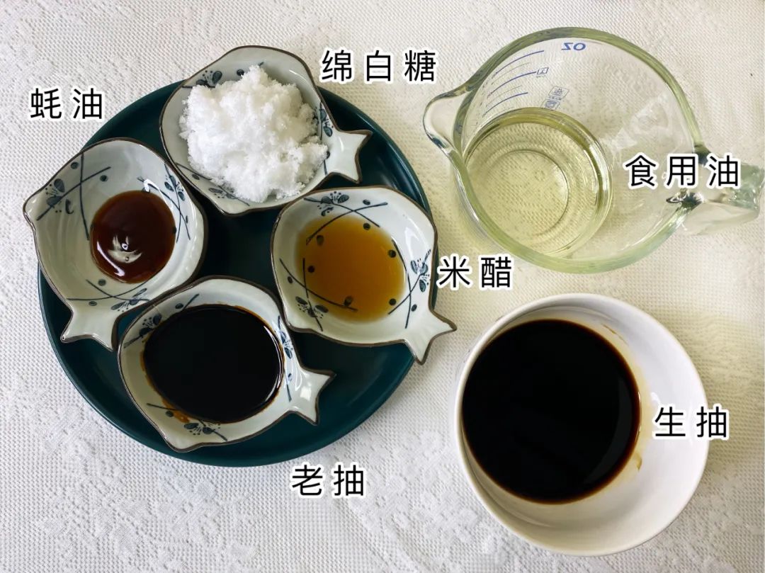 食用油100克、生抽30克、绵白糖30克、老抽20克、米醋10克、蚝油10克(将除食用油以外的调料提前搅拌均匀)。