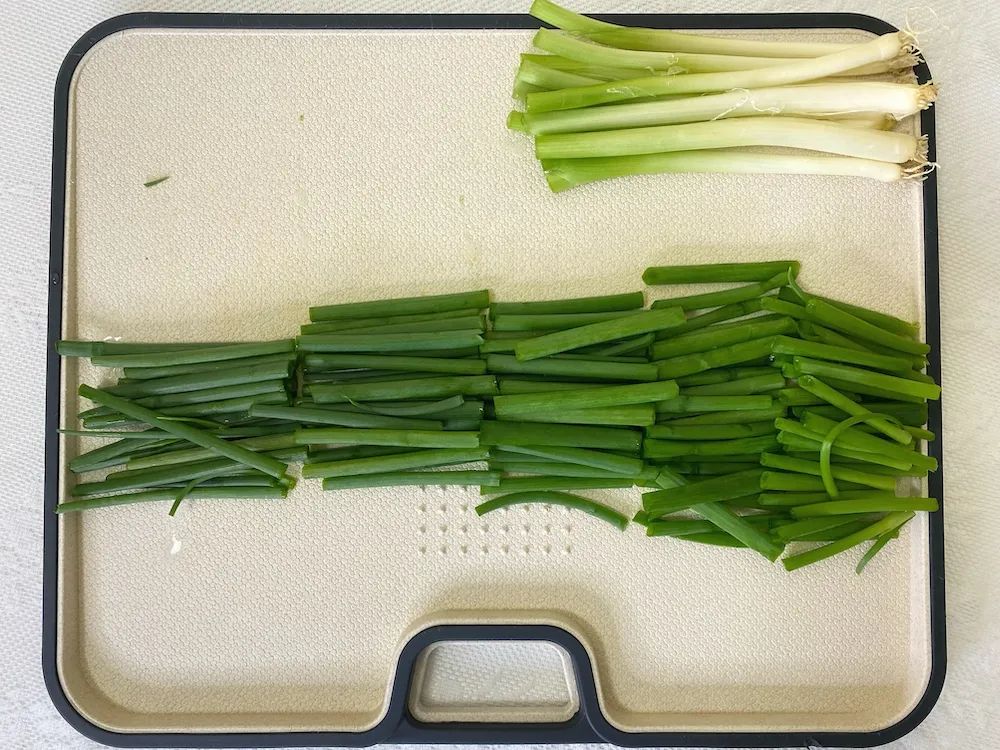小葱的绿叶部分比大葱的葱液少,不会有那么强的辛辣味,炸的时候也降低了蹦油的程度。葱白的部分不需要,绿叶部分切成小段儿。