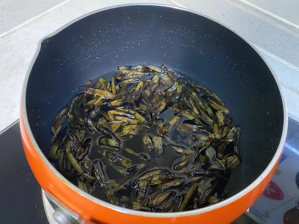这个时候葱段儿就会变成接近黑色的了,其实主要让葱油看起来有食欲的就是老抽。