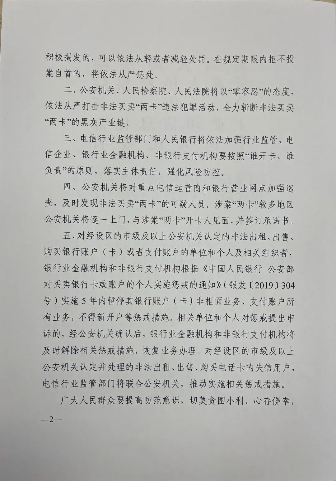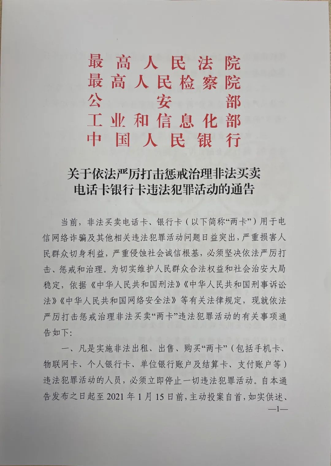 近日,最高人民法院、最高人民检察院、公安部、工业和信息化部、中国人民银行联合发布《关于依法严厉打击惩戒治理非法买卖电话卡银行卡违法犯罪活动的通告》,以“零容忍”的态度严厉打击非法买卖“两卡”违法犯罪活动,进一步加强行业监管,在全国范围内对涉“两卡”违法犯罪人员实施惩戒,深入推进“断卡”行动,全力斩断非法买卖“两卡”黑灰产业链条。