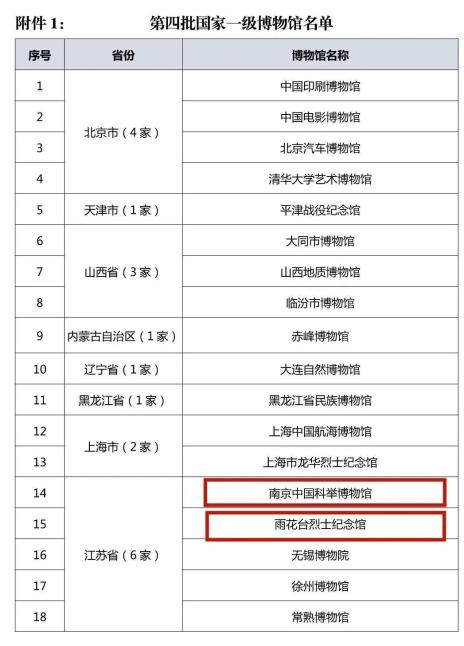至此,包括南京博物院、侵华日军南京大屠杀遇难同胞纪念馆、南京市博物总馆在内,南京一共有了5家国家一级博物馆。南京市江宁区博物馆、南京大报恩寺遗址博物馆、明孝陵博物馆等,均晋升为国家二级博物馆。南京江南丝绸文化博物馆等非国有博物馆评定为国家三级博物馆,也实现了零的突破。南京中国科举博物馆