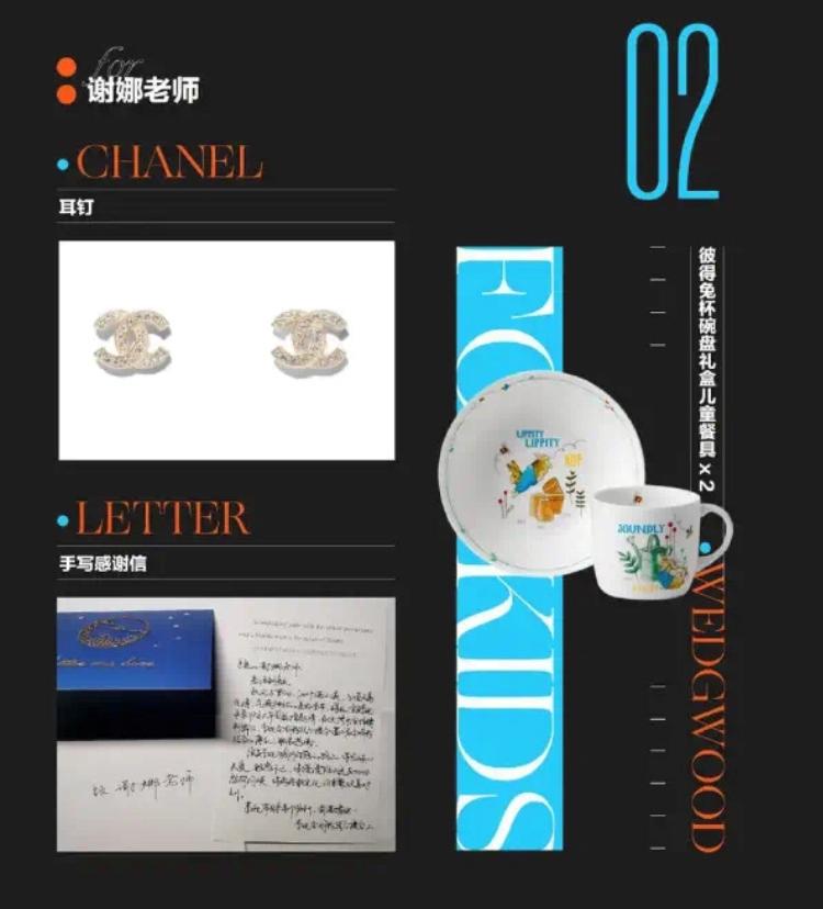 送给谢娜的礼物则是香奈儿耳钉、适合孕妈妈的化妆品套盒、按摩油、高端的奢侈品儿童护肤品。